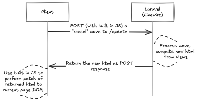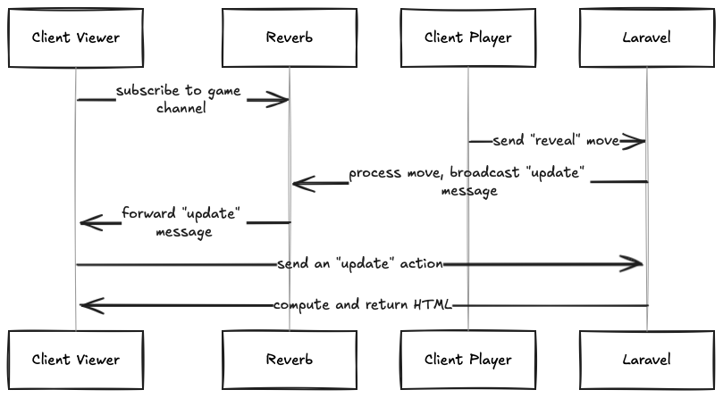 正是在这里,Websocket 客户端 Laravel Echo 和第一方 Websocket 服务器 Reverb 成为了最大的赢家。我们可以从每个前端客户端订阅 Reverb 服务器,使用提供的 Laravel Echo 中的一小段 JS 来订阅游戏频道。当任何客户端在棋盘上移动时,Laravel 服务器都会通过 Reverb 服务器向所有订阅者广播“更新”消息。然后,每个客户端都会获取最新状态以修补到其 HTML 中。以下是从“查看者”和“玩家”的角度简要介绍的流程。