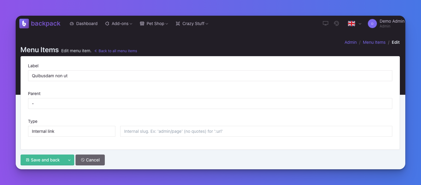用于添加、编辑、删除、重新排序和嵌套菜单项的 CRUD。它提供了使用内部或外部链接的能力,你可以链接到来自 背包\菜单管理器 。