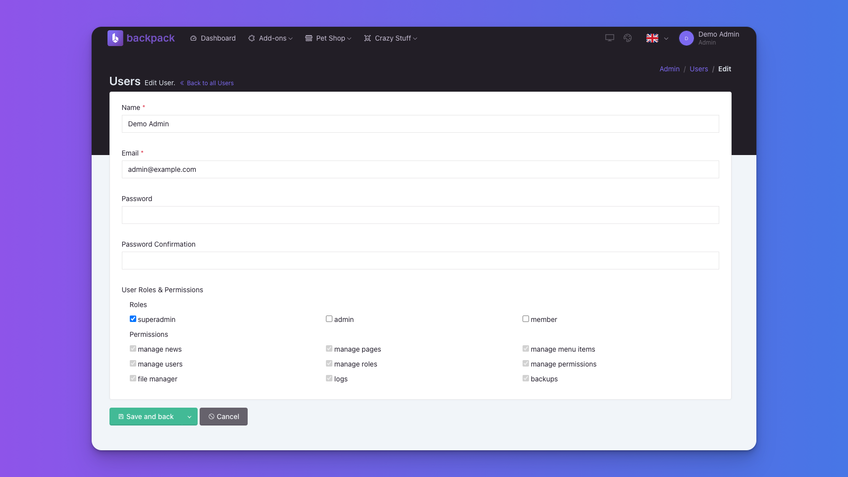 用于管理用户、角色和权限的管理面板,因此您可以为用户分配多个角色和权限。