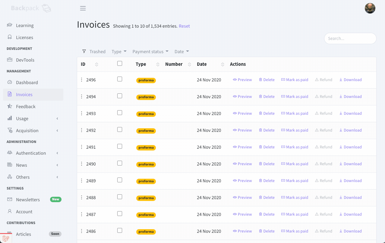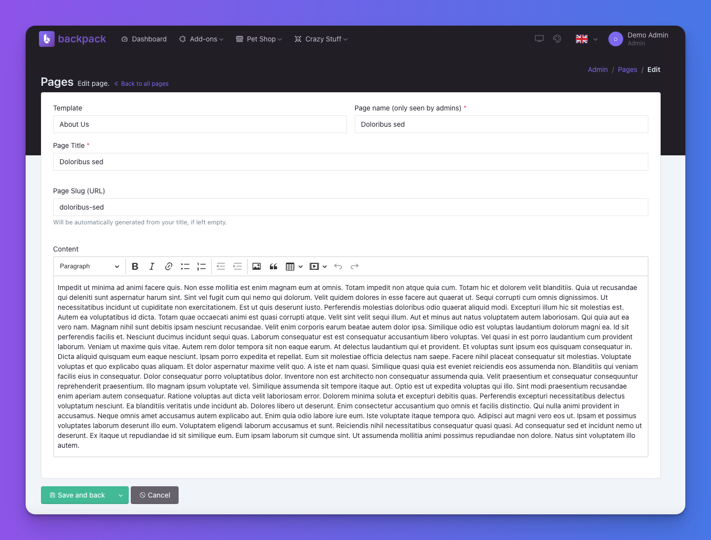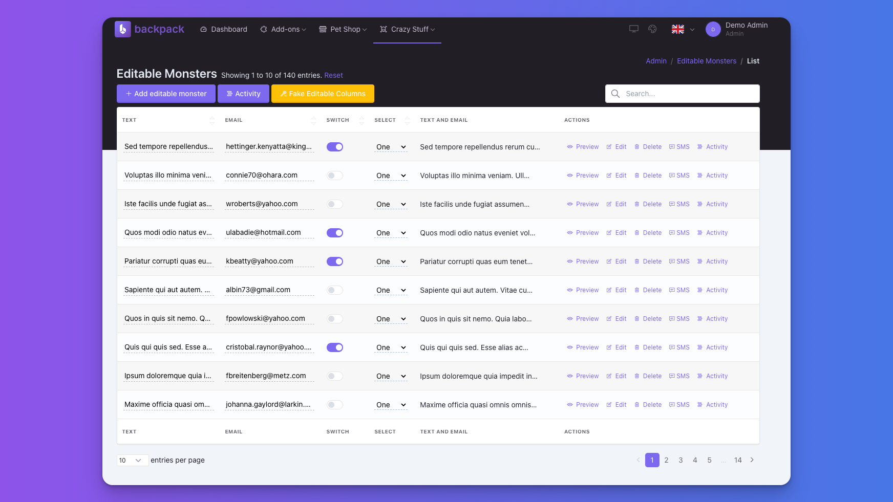 - 背包 CRUD 它加速了为管理面板构建 CRUD 的过程。它提供 DataTables 集成、创建和更新具有超过 28 种字段类型的表单、使用表单请求进行验证、多语言支持等等。