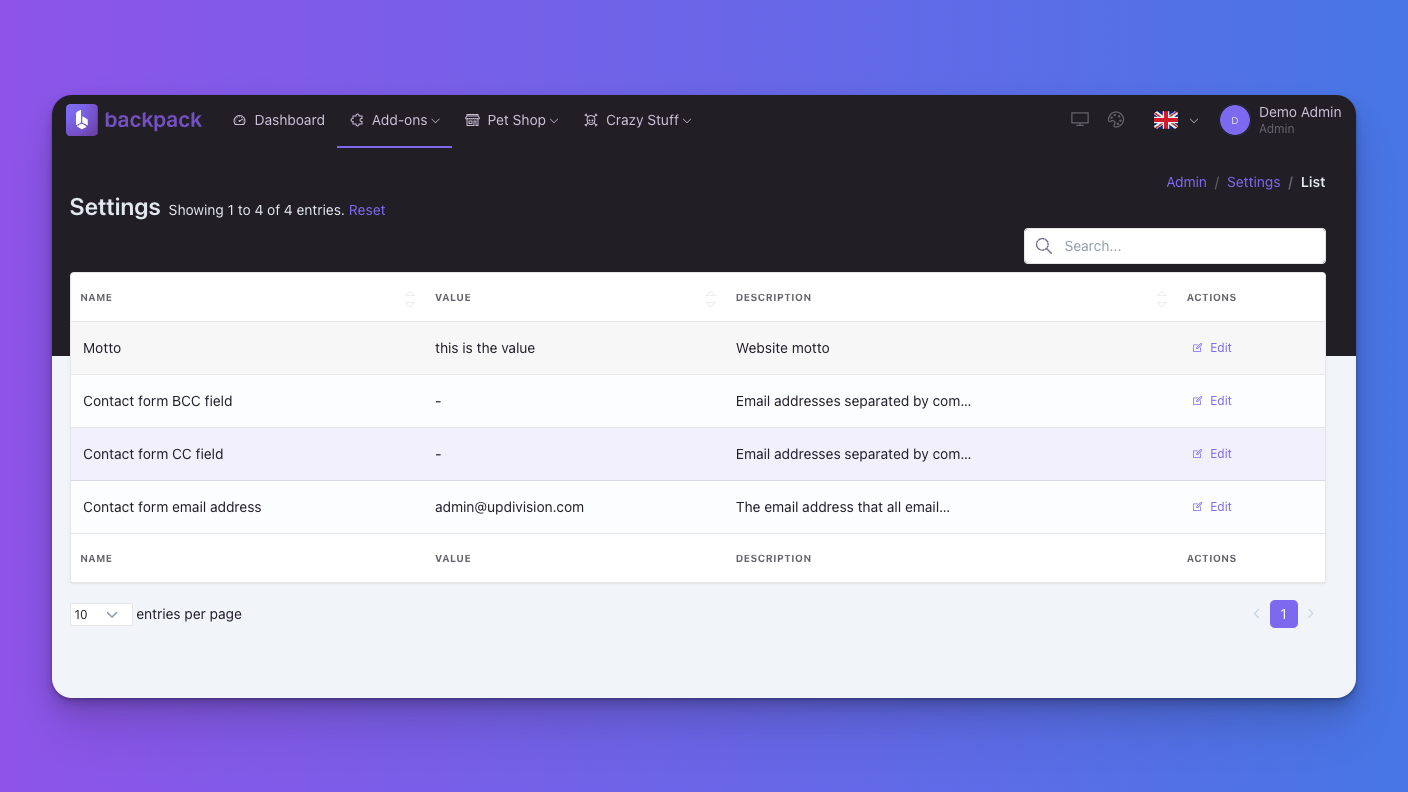 一个用于轻松更改应用程序设置的界面。它提供不同类型的设置,例如电子邮件、复选框、文本、数字等。请注意,它不包含用于添加新设置的界面,因此您应该直接将它们添加到数据库中。如果您想检索任何设置的值,您可以使用