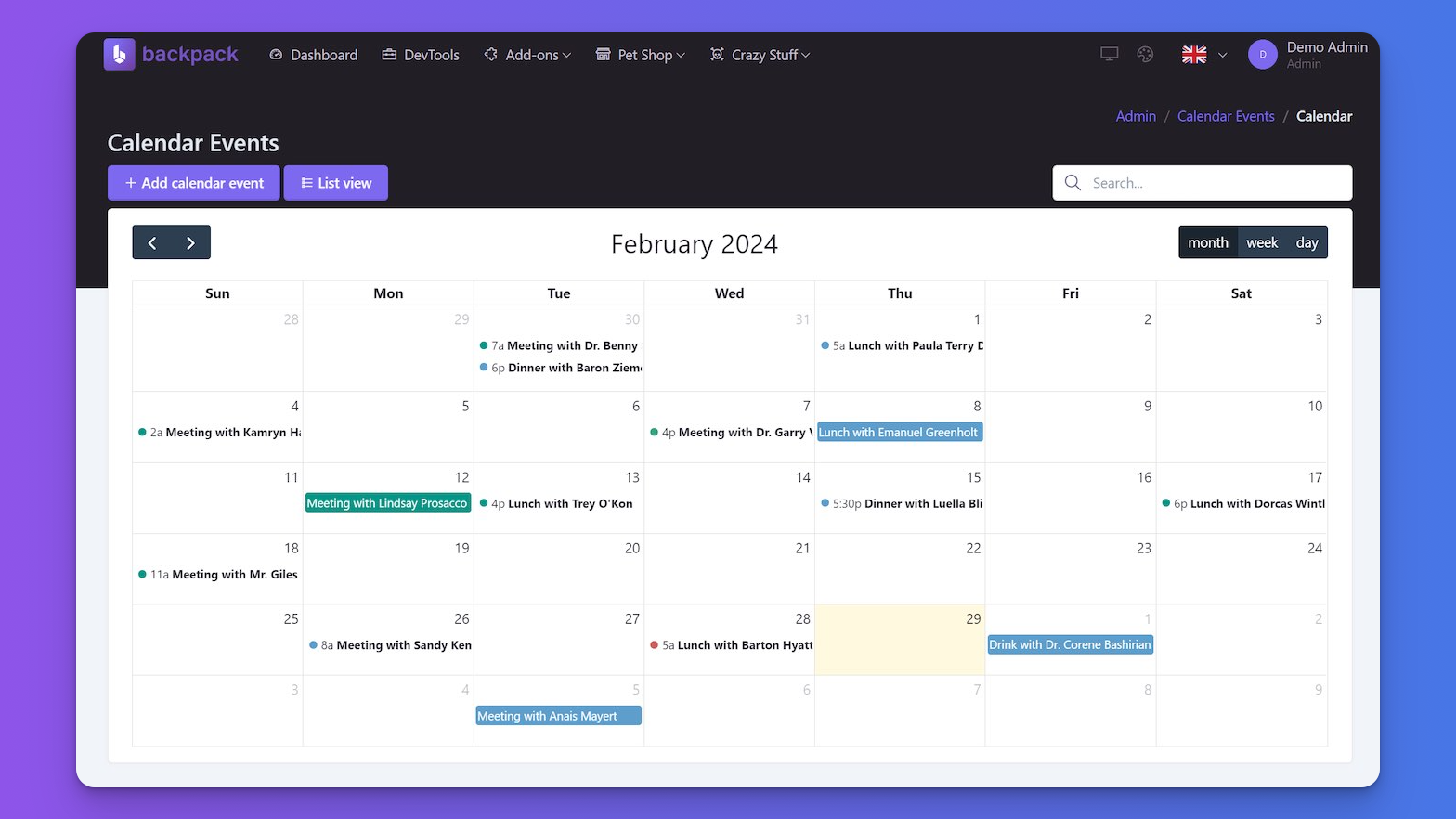 添加 日历视图以进行 CRUD ; 让管理员列出、搜索和预览日历上的数据库条目,以及通过拖放快速编辑。集成 FullCalendar 可节省大量时间。