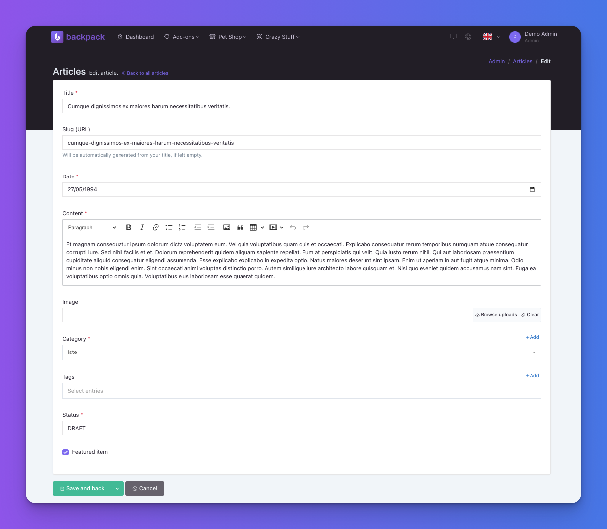 它是一个 CRUD,用于快速创建与新闻相关的任何内容;您可以创建文章、标签和类别,并支持嵌套类别和重新排序。