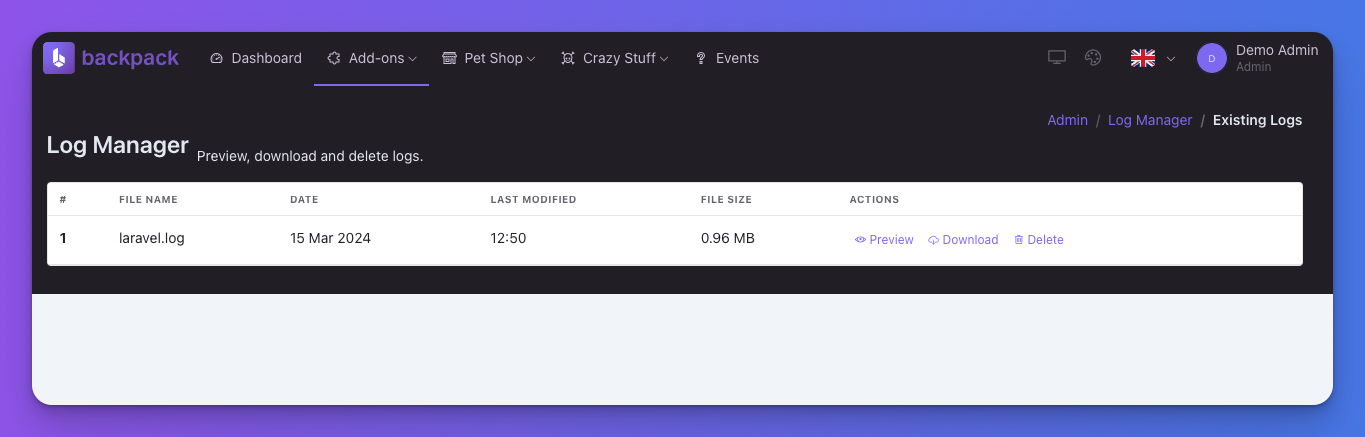 处理 Laravel 日志文件的接口。您无需通过 SSH 访问服务器即可下载、预览或删除。