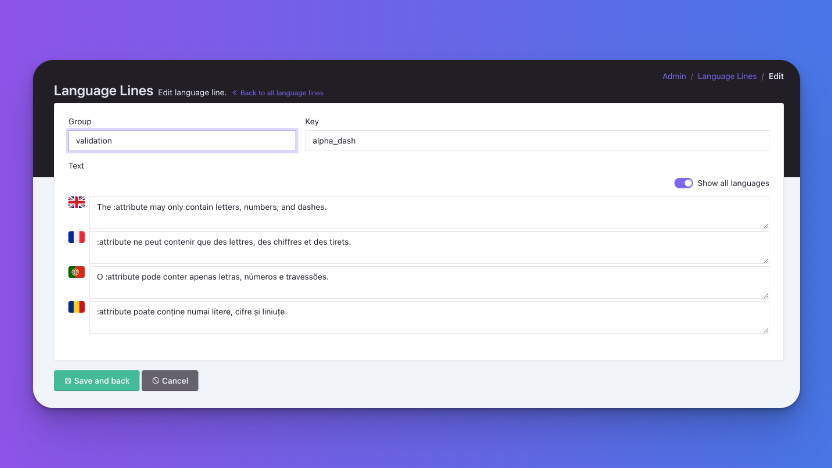 翻译经理 提供一个简单的用户界面来帮助您处理 Laravel 应用程序中的翻译。直接从应用程序语言文件中的界面编辑、搜索和过滤所有翻译(包括供应商翻译)。